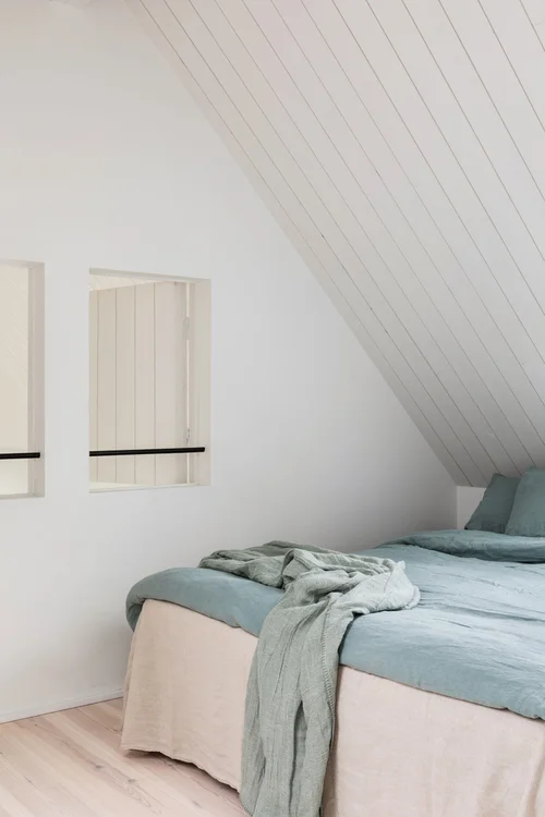 - Om undervåningen har en horisontell, jordad karaktär så har övervåningen, där flera rum har mer än fyra meter i tak, en helt annan, luftigare känsla. Rummen flyter ihop med varandra på höjden, volymen bryts upp av både vertikala och diagonala siktlinjer.