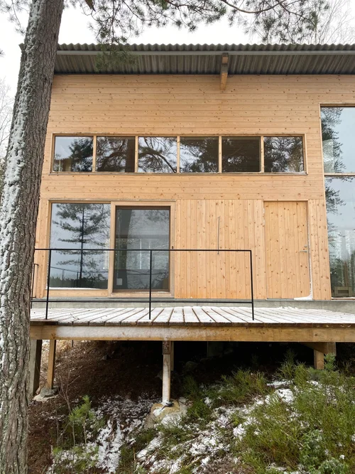 - Övervåningens glaspartier liksom alla smidesdetaljer är platsbyggda vilket håller nere kostnaden väsentligt. Fasadens ribbpanel går igen i taket, ribborna möts exakt. Alla detaljer är noga genomarbetade.
